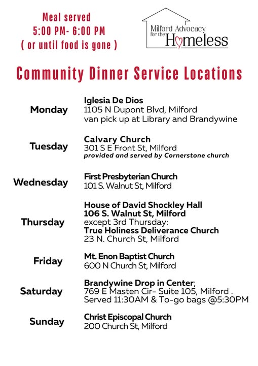 We offer free dinners every night of the week for anyone in need in Milford. There is no cost and no requirements to receive a meal, just come as you are and sign in when you arrive. Our goal is to provide not only nourishment but also a welcoming space where you are treated with dignity, kindness, and respect.